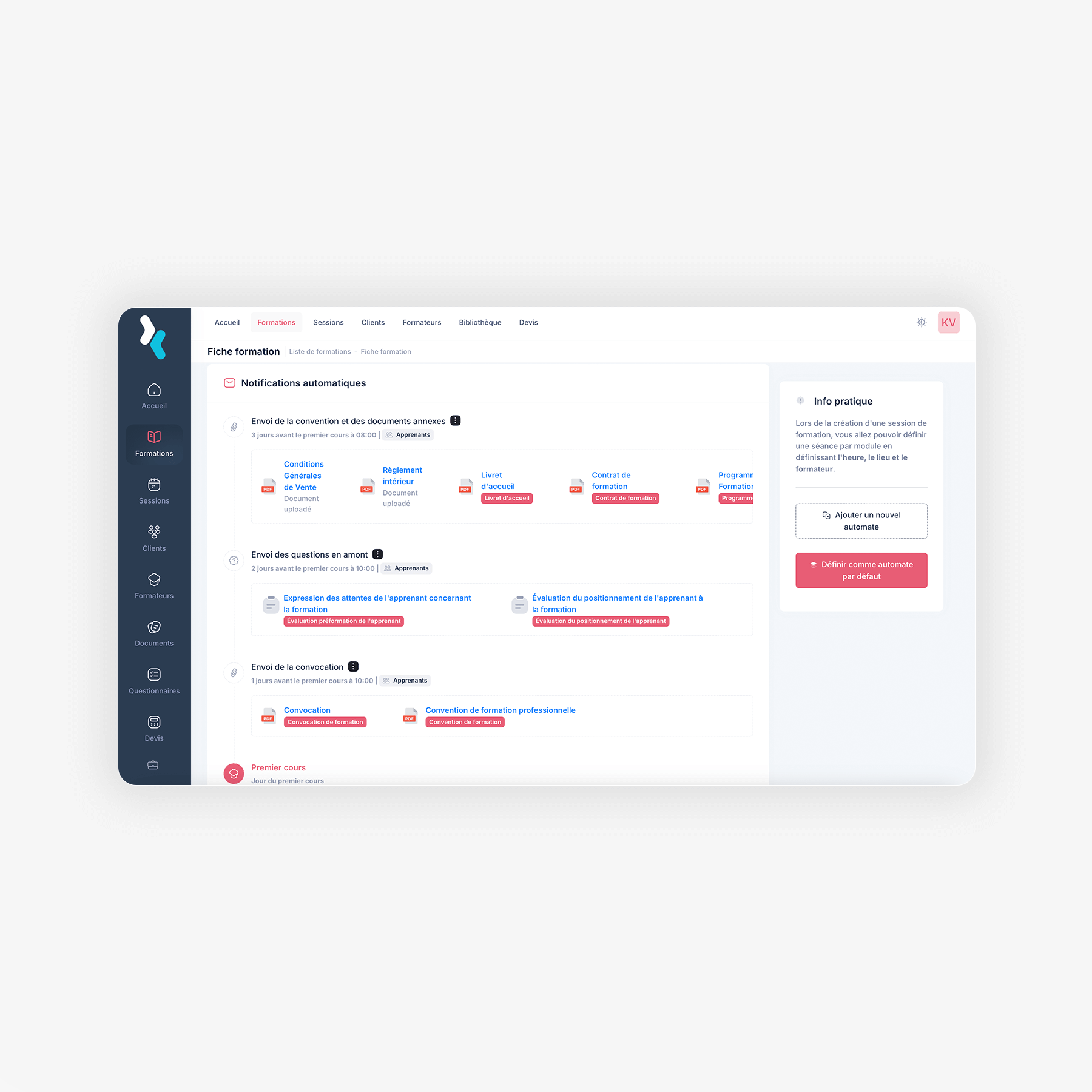Créez et envoyez vos questionnaires d’évaluation en un clic. Mesurez la satisfaction de vos apprenants et suivez vos indicateurs Qualiopi facilement.