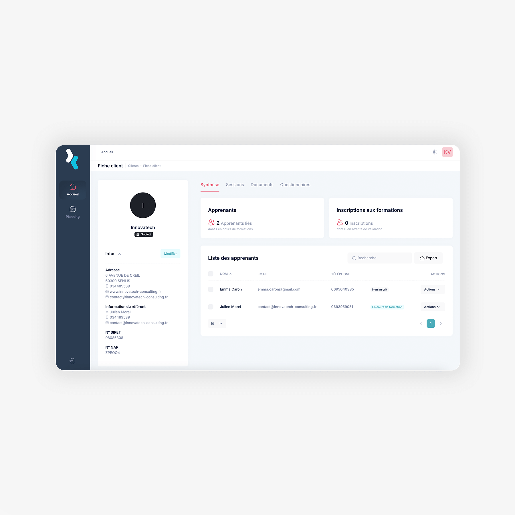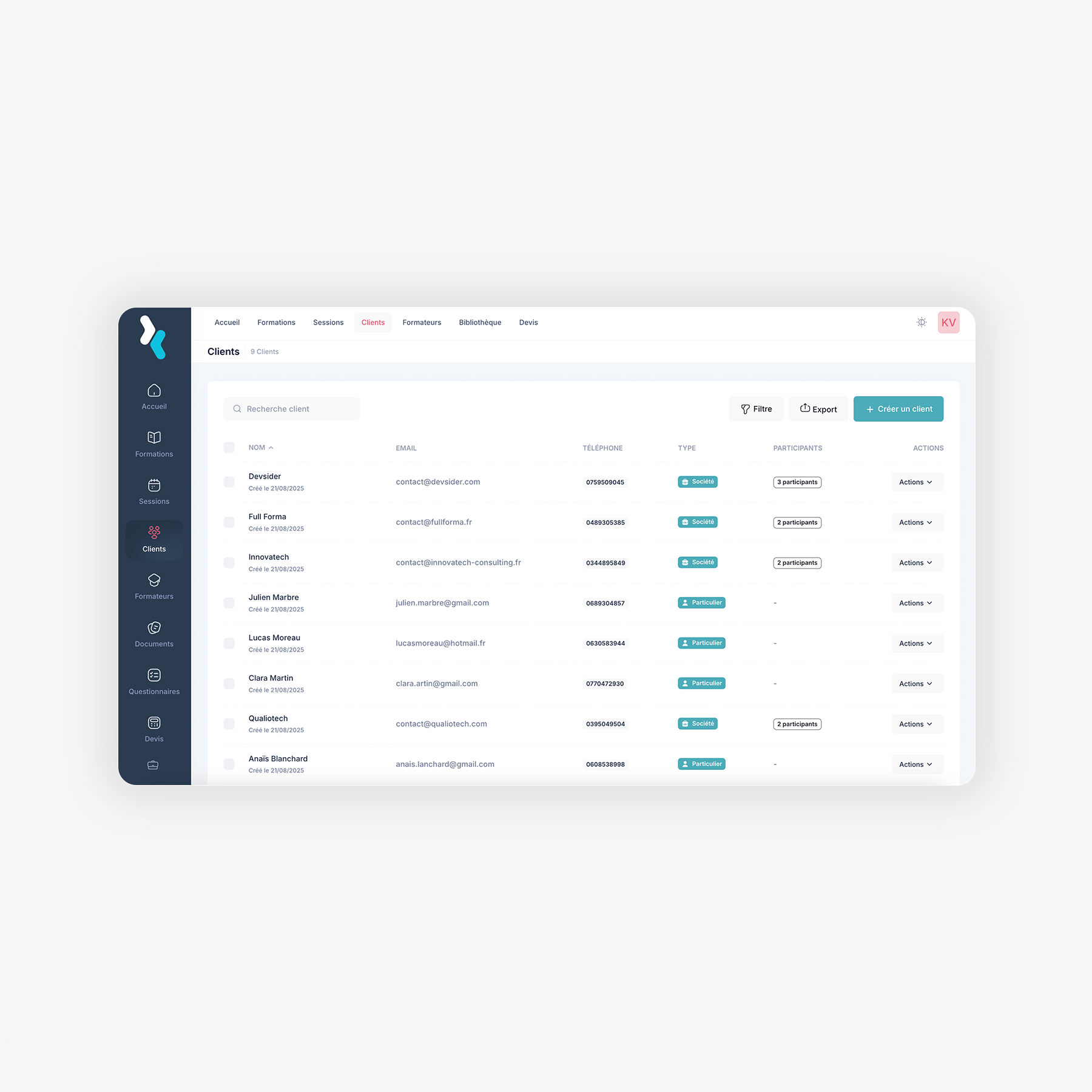 Regroupez clients, apprenants et formateurs dans une seule base de données pour un suivi administratif et Qualiopi simplifié.