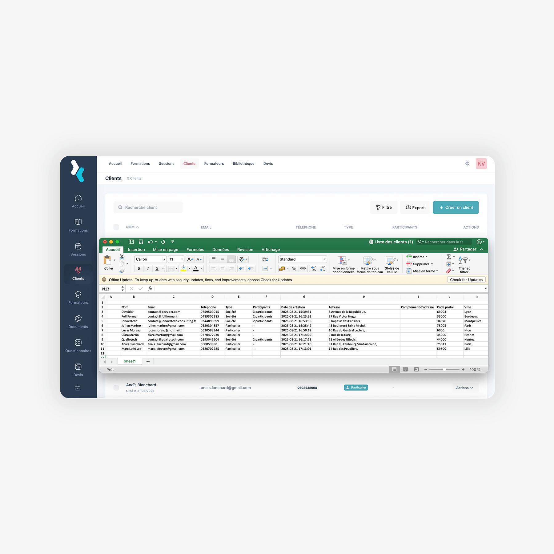 Exportez vos formations, formateurs, clients, apprenants et documents en Excel, PDF ou CSV. Une solution simple, rapide et conforme Qualiopi.