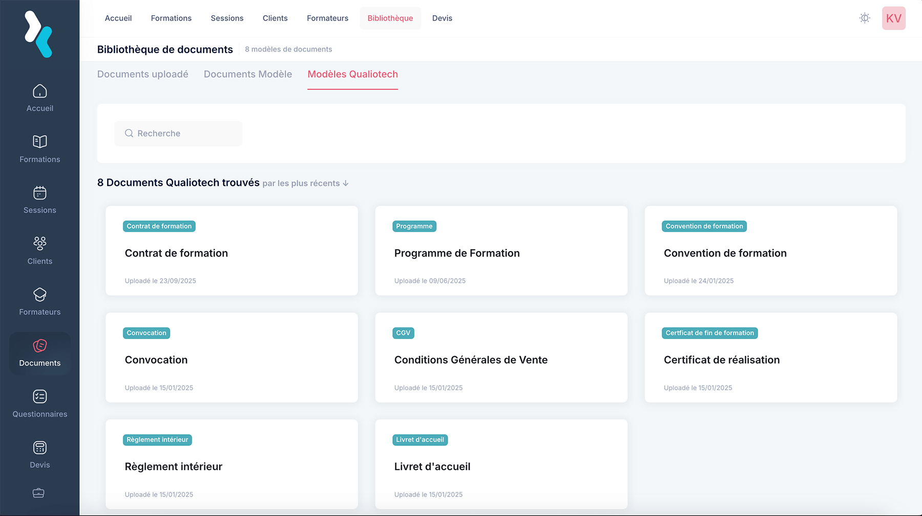 Accédez à une bibliothèque complète de modèles de documents prêts à l’emploi et conformes aux exigences Qualiopi. Conventions, convocations, attestations ou questionnaires : tous les modèles essentiels sont disponibles et personnalisables avec les informations de votre organisme.