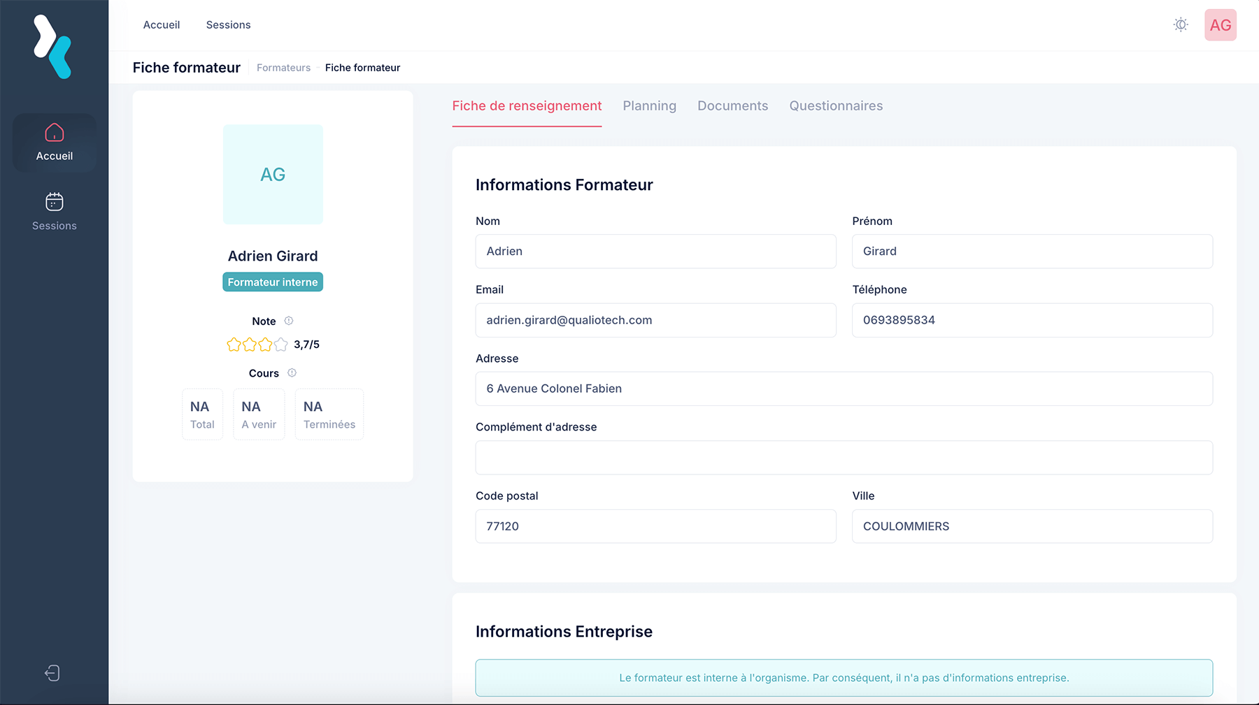 Offrez à vos intervenants un espace personnel entièrement dédié à leur activité de formation. Depuis leur tableau de bord, les formateurs peuvent consulter leurs sessions, télécharger les documents associés, émarger les présences et suivre les retours des apprenants.