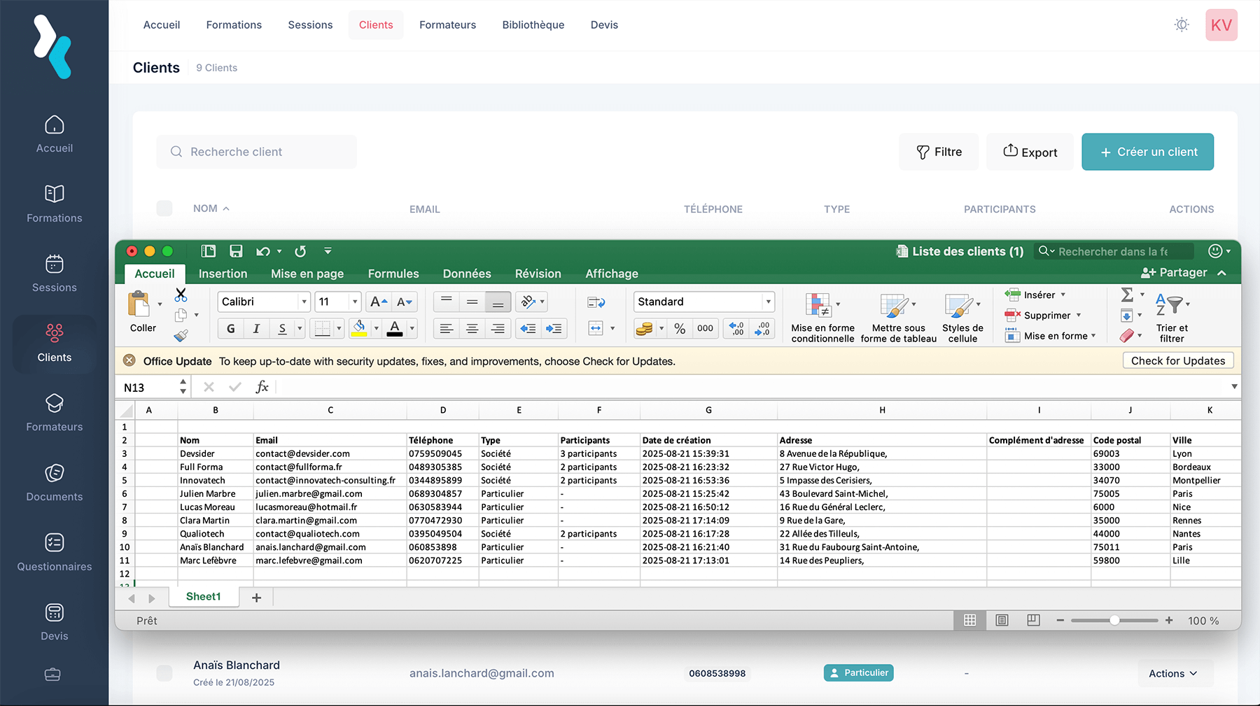 Exportez facilement vos informations administratives, listes des clients, des apprenants, sessions ou documents en quelques clics. Les exports sont disponibles en plusieurs formats (Excel, PDF, CSV) pour s’adapter à vos besoins de reporting, d’archivage ou de partage.