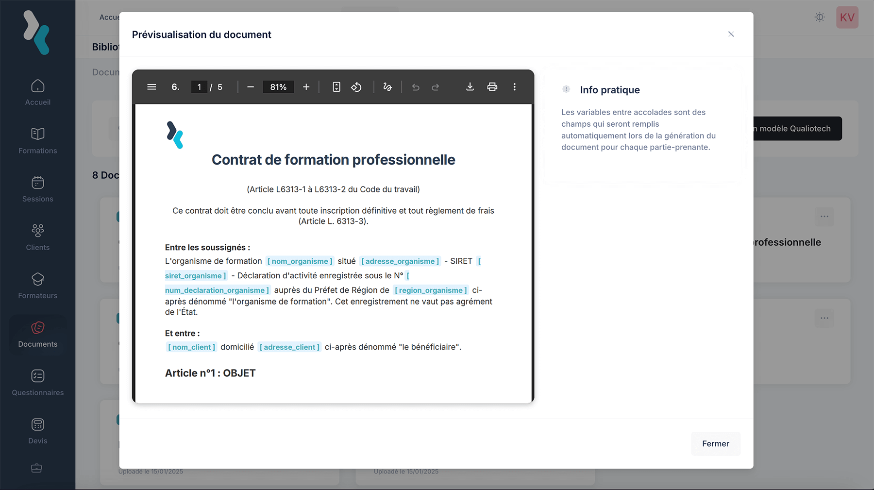 Gagnez un temps précieux grâce à la génération automatique de vos documents administratifs. Conventions, convocations, feuilles d’émargement, attestations de fin de formation ou devis sont créés en un clic à partir de vos données. Chaque modèle est personnalisable avec votre logo et conforme aux exigences Qualiopi. Simplifiez la gestion documentaire et réduisez les risques d’erreur grâce à une automatisation complète.