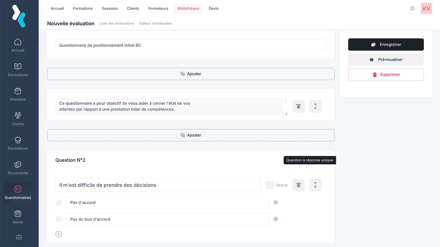 Créez et diffusez facilement vos questionnaires d’évaluation et de satisfaction grâce à un système automatisé et personnalisable. En quelques clics, concevez vos formulaires à chaud et à froid, collectez les retours de vos apprenants et analysez les résultats directement depuis votre tableau de bord.