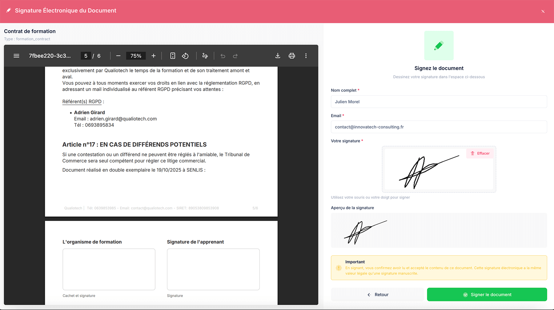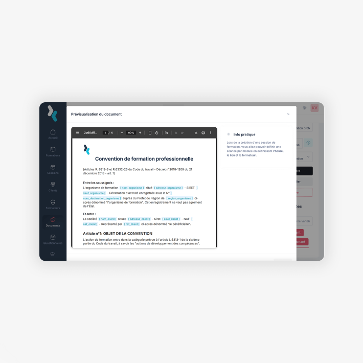 Simplifiez la validation de vos documents grâce à la signature électronique intégrée. Les conventions, contrats ou attestations peuvent être signés en ligne par les formateurs, les apprenants ou les clients en toute sécurité.